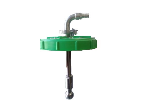 ADAPTADOR EN ACERO INOXIDABLE PARA TAPA PLASTICA, EN LA PARTE SUPERIOR ESTE ACCESORIO CUENTA CON UN RACORD PARA MANGUERA, MÁS CODO CON ROSCA HEMBRA Y EXTREMO CLAMP + UNIÓN DEL MISMO TIPO, EN LA PARTE INFERIOR UNA BOCHA CIP ROSCADA. SOSTENIDO CONTRA LA TAPA CON UN DISCO DE ACERO INOXIDABLE, ABULONADO A LA MISMA.